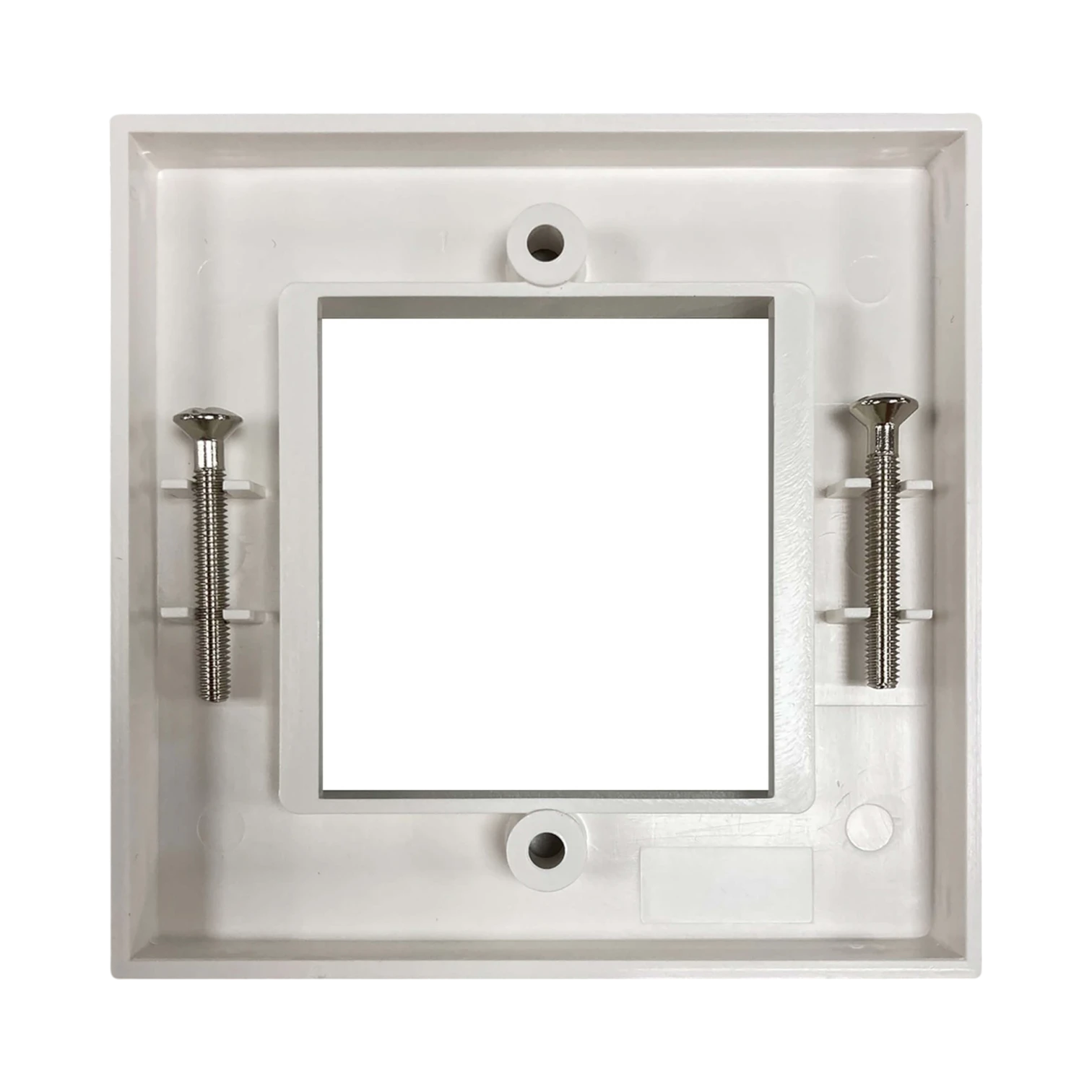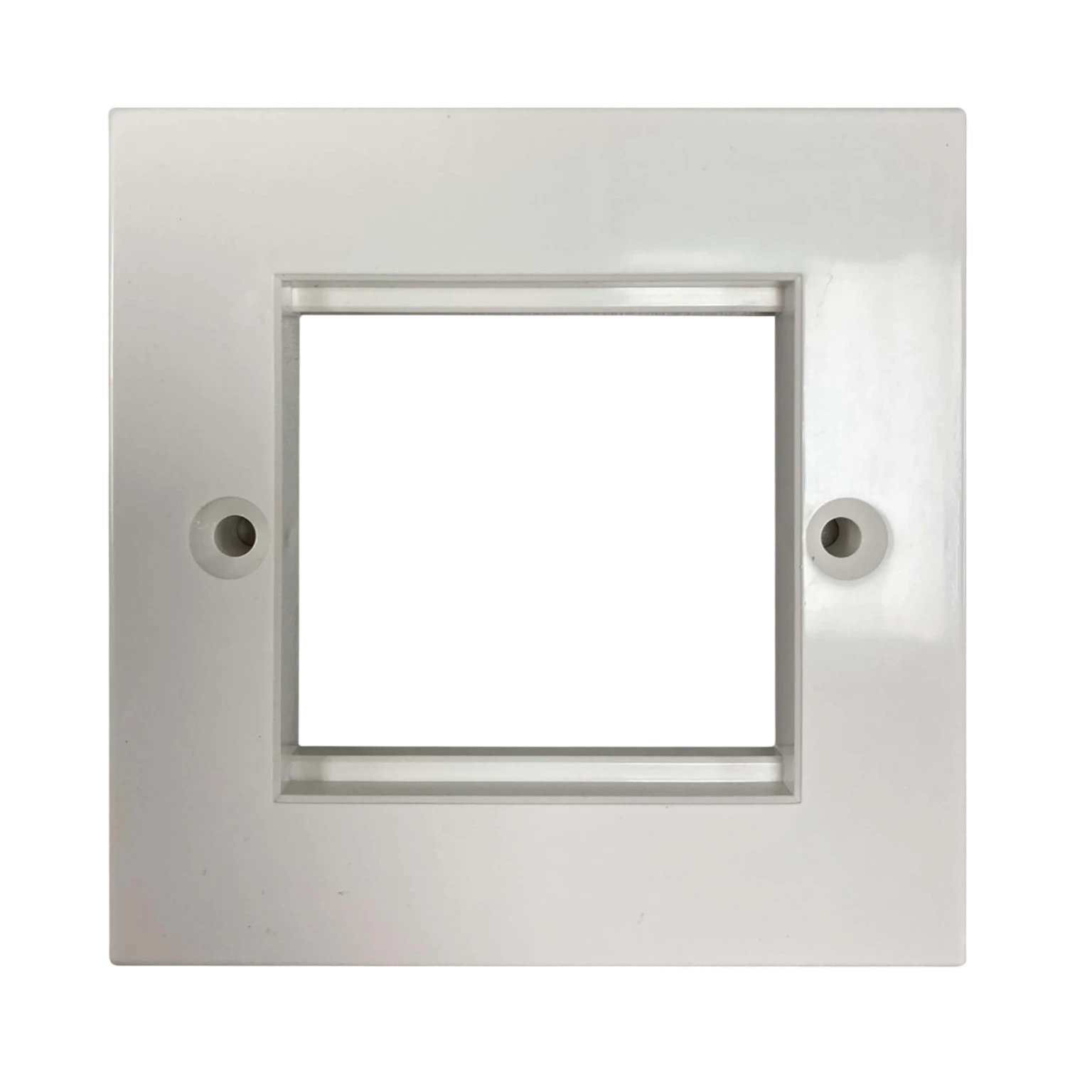 The Tripp Lite N042U-WF1-2 is a single-gang frame designed to fit UK-style wall boxes, providing a clean and secure mounting solution for Tripp Lite N042U-Series insert modules. Its 86 x 86 mm outer dimensions and 50 x 50 mm opening allow for easy installation of a variety of connectivity inserts, keeping cables and connectors flush with the wall for a neat appearance. Molded from high-impact ABS plastic with a UL 94V-0 flame-retardant rating, this frame offers both durability and safety for in-wall wiring in residential, office, or commercial environments.