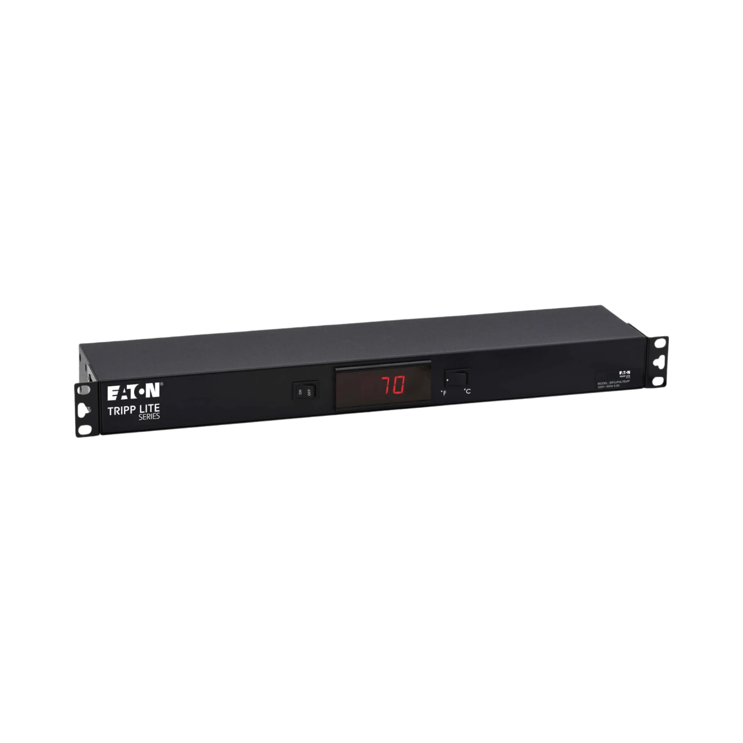 The Tripp Lite SR1UPNLTEMP is a 1U blanking panel designed to improve airflow management in 19-inch EIA rack enclosures while providing real-time temperature monitoring. It features a digital temperature sensor with a 6-foot probe cable and a front-panel LCD that displays temperatures in Fahrenheit or Celsius, helping you maintain optimal operating conditions for your rack-mounted equipment.