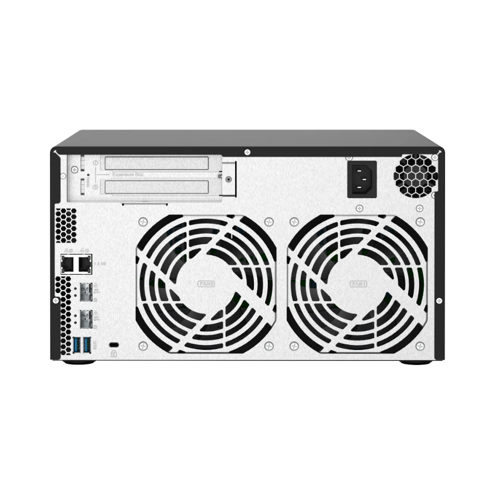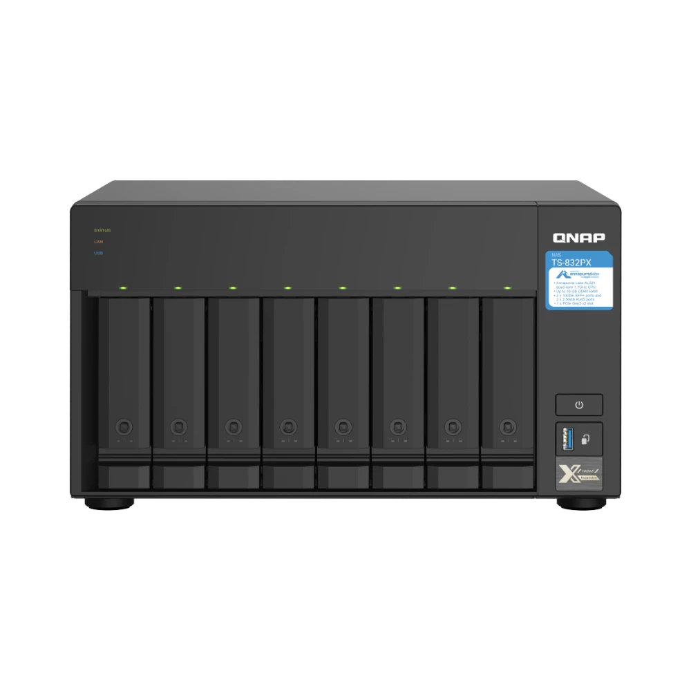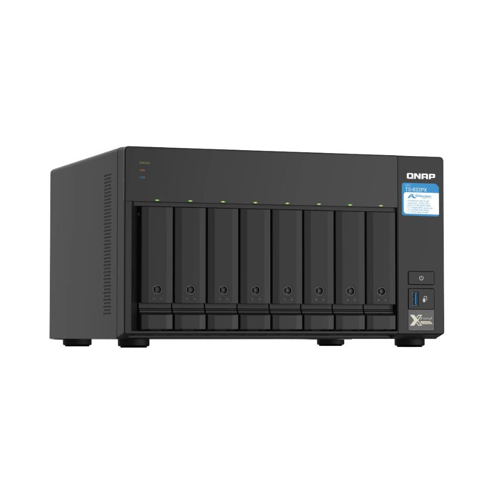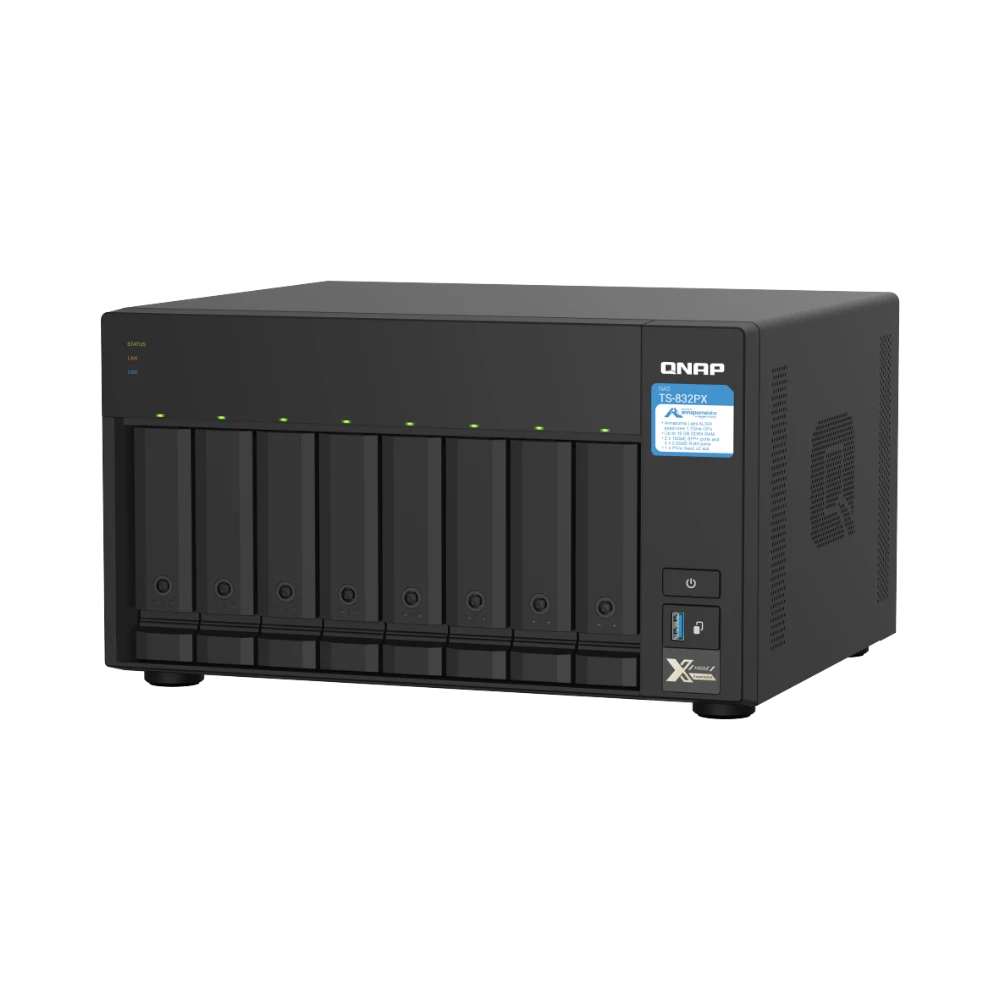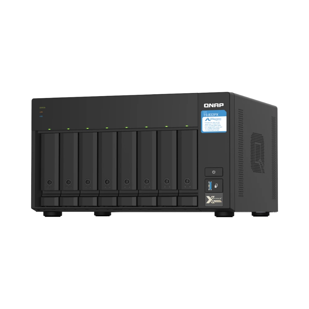 The QNAP TS-832PX-4G-US is an 8-bay network-attached storage (NAS) enclosure designed to meet demanding storage requirements with flexibility and speed. It supports both 2.5-inch and 3.5-inch SATA III drives, allowing you to configure a mix of hard drives and solid-state drives. Powered by a 1.7 GHz quad-core ARM Cortex-A57 processor and 4GB of DDR4 RAM, expandable up to 16GB, this NAS delivers reliable performance for multitasking and data-intensive applications. Its dual 10GbE SFP+ and dual 2.5GbE RJ45 ports provide versatile high-speed network connectivity, making it suitable for small to medium-sized businesses or advanced home setups.