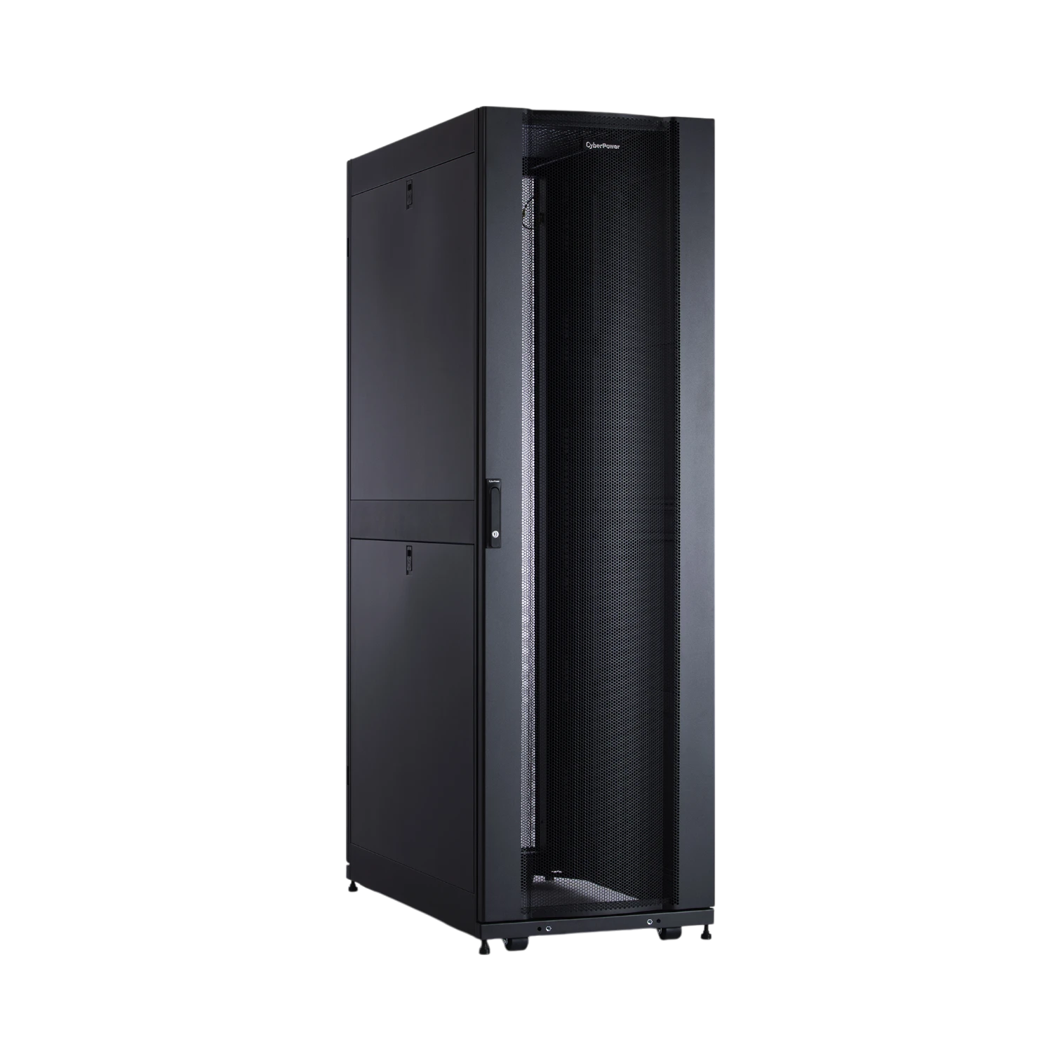 The CyberPower CR42U11001 is a 42 rack unit enclosure designed to securely house EIA-310 compliant 19-inch equipment, providing a robust solution for organizing servers, networking gear, and other critical hardware. It features adjustable rack angles to fit various mounting depths, ensuring compatibility with a wide range of devices. With a load capacity of up to 3,000 pounds when stationary and 2,250 pounds in motion, this enclosure supports heavy and dense equipment setups while maintaining airflow through perforated metal doors and a ventilated roof to keep components cool.