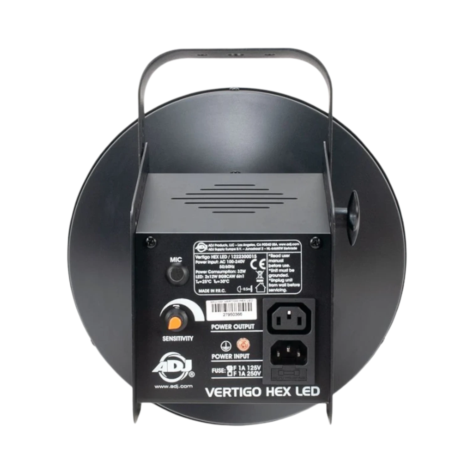 With 60 sound-activated reaction modes, the Vertigo HEX synchronizes lighting effects with music, creating an immersive experience. Its energy-efficient operation consumes up to 30 watts and supports multi-voltage input from 100V to 240V, making it adaptable to different power environments. The fixture also features IEC AC input and output for daisy-chaining multiple units, reducing cable clutter and simplifying installation.