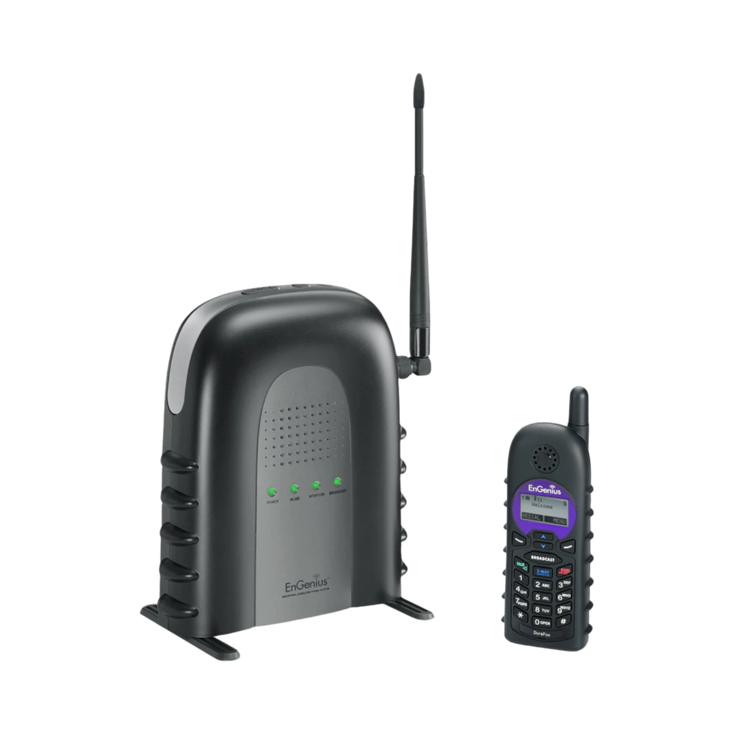 The EnGenius DURAFON-SIP is a long-range cordless phone system designed to maintain clear and reliable communication across large indoor and outdoor environments. It supports coverage up to 12 floors or 250,000 square feet indoors and extends to 3,000 acres outdoors, making it suitable for extensive facilities. This system accommodates up to 10 handsets and SIP accounts, allowing multiple users to stay connected simultaneously while integrating seamlessly with IP-PBX systems through standard SIP protocols.