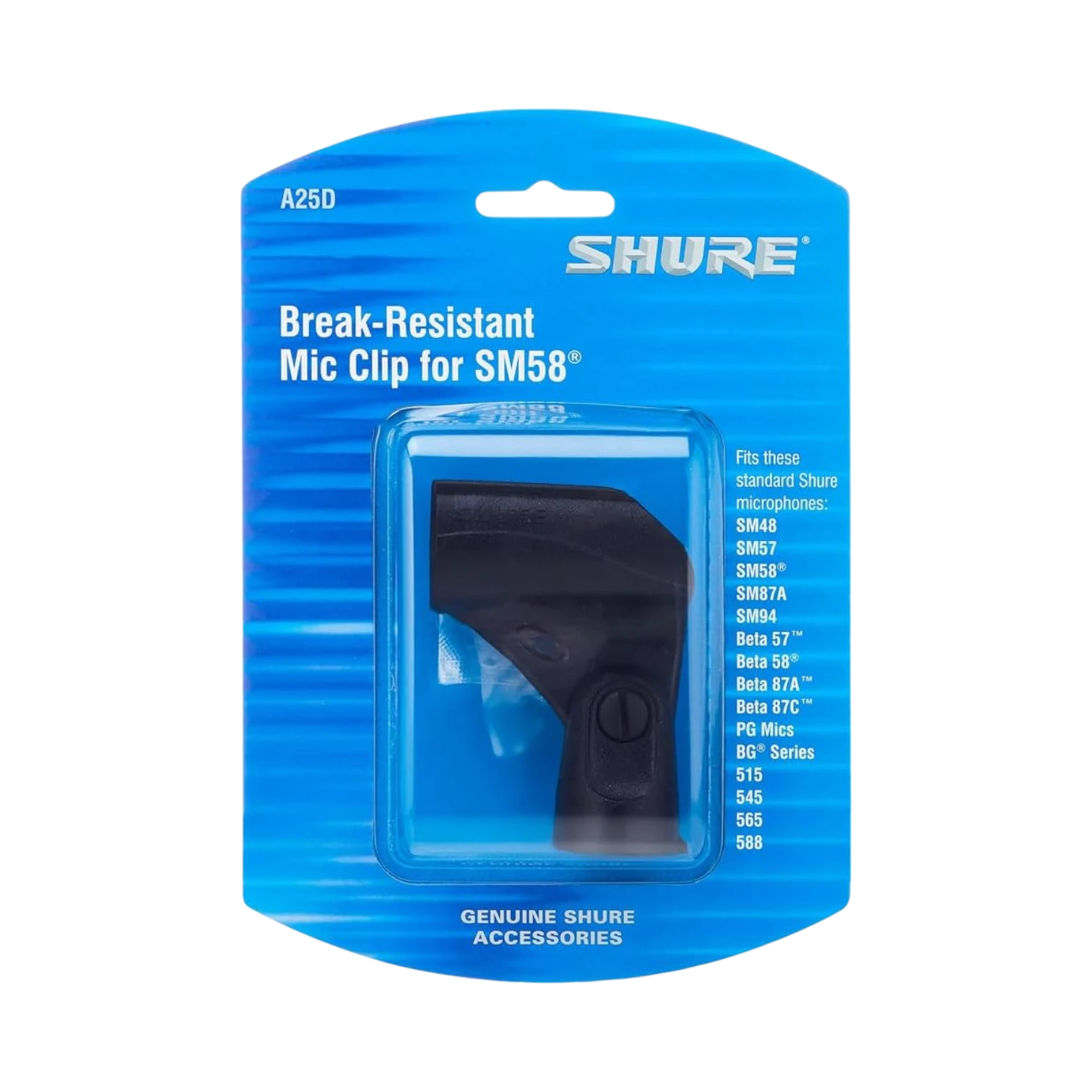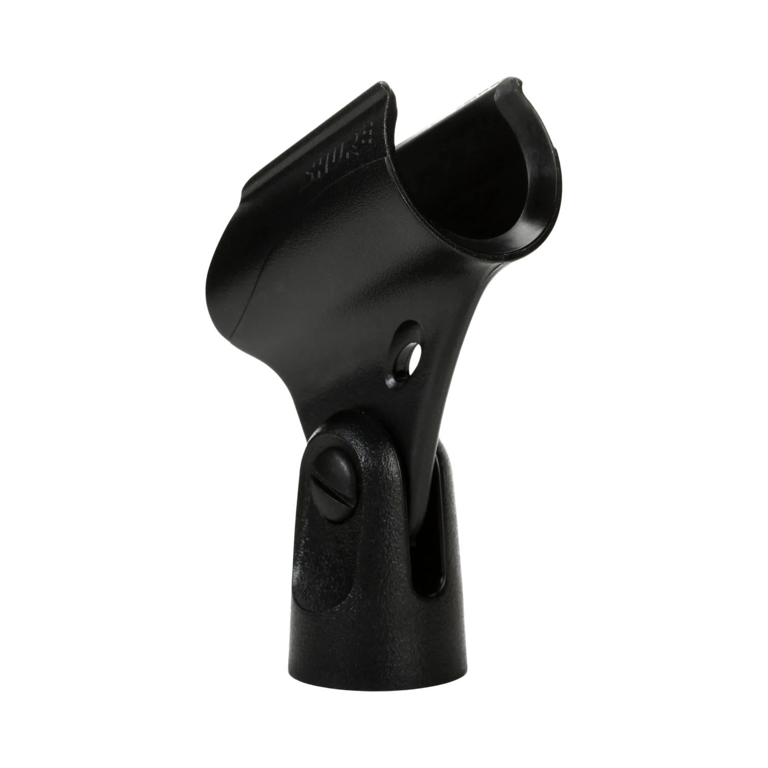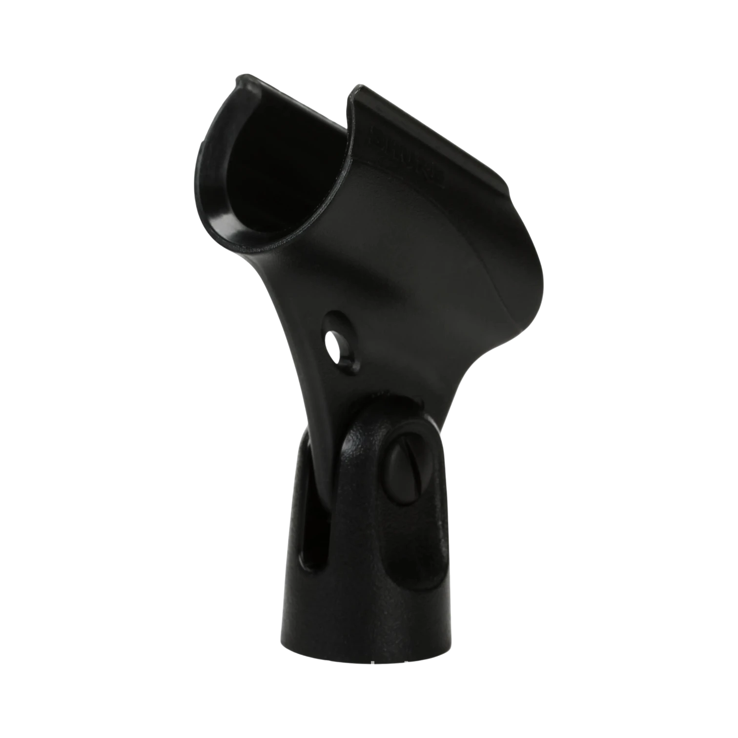 The Shure A25D is a microphone stand adapter designed to securely hold handheld microphones with barrel diameters between 25 mm and 30 mm. It provides a reliable connection between your microphone and standard mic stands, making it suitable for both studio and live stage environments. The adapter fits popular Shure models such as the SM57, SM58, Beta 58A, and KSM9, ensuring broad compatibility for professional and enthusiast use.