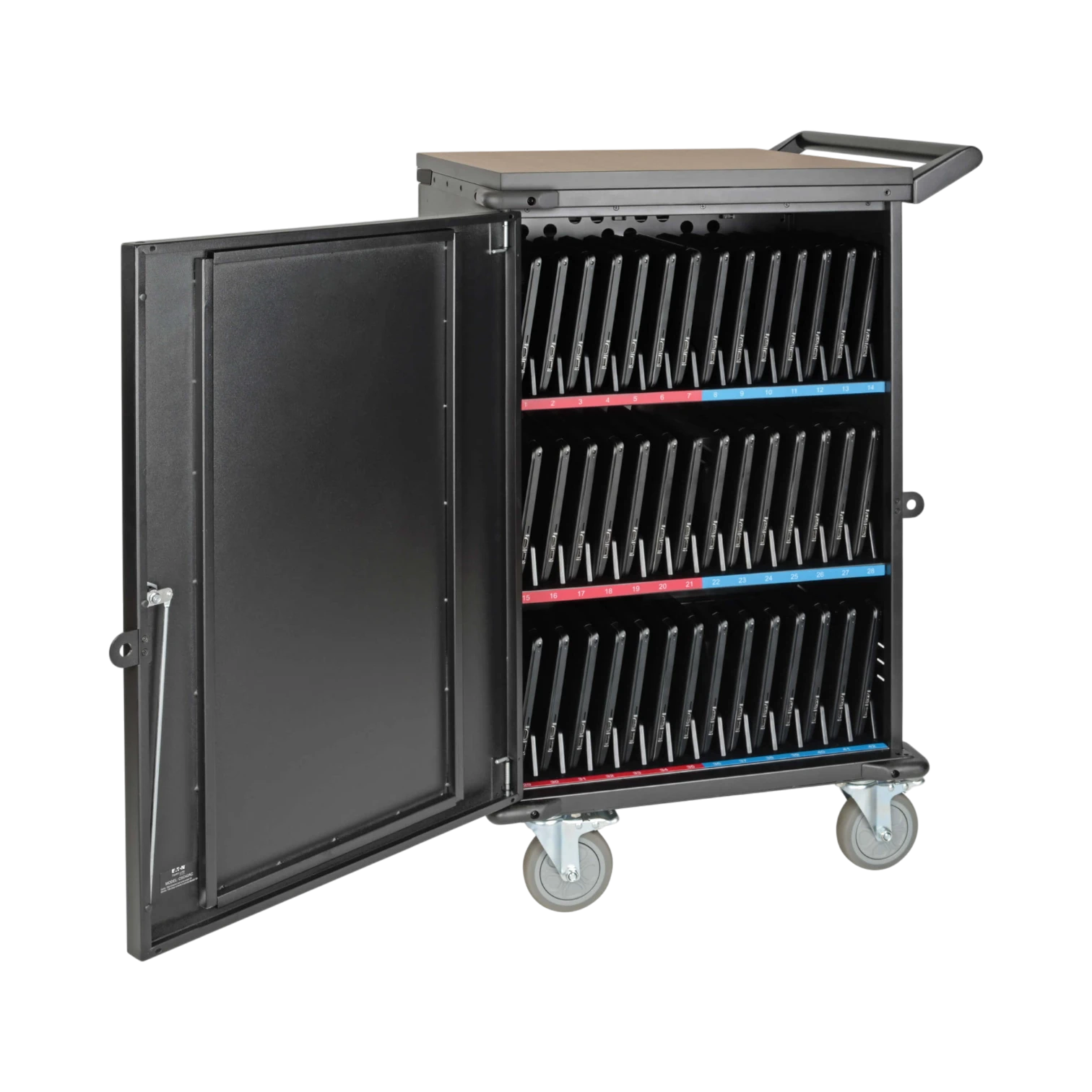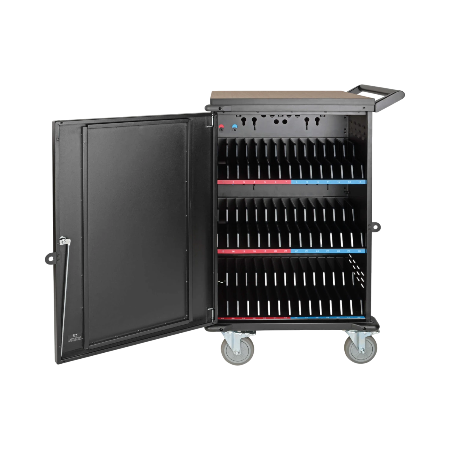The Eaton CSC48AC is a mobile charging cart designed to charge, organize, and secure up to 48 laptops and Chromebooks simultaneously. It uses timed AC charging with two alternating zones to prevent electrical overloads, ensuring efficient power distribution. The cart’s heavy-duty steel construction and lockable doors provide security, while its large swivel casters and cable management system make it easy to move and keep cords tidy in busy environments like schools, offices, or training centers.