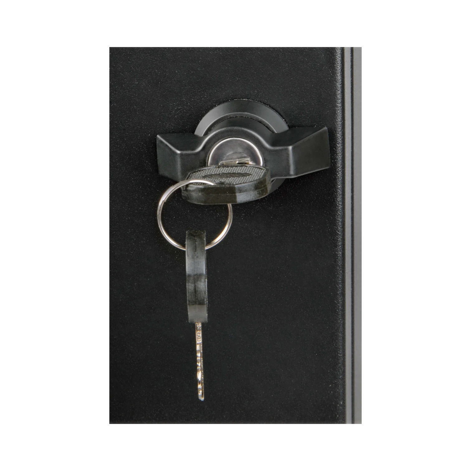 - Locking steel cabinet with separate compartments for devices and their power adapters to keep everything organized and secure