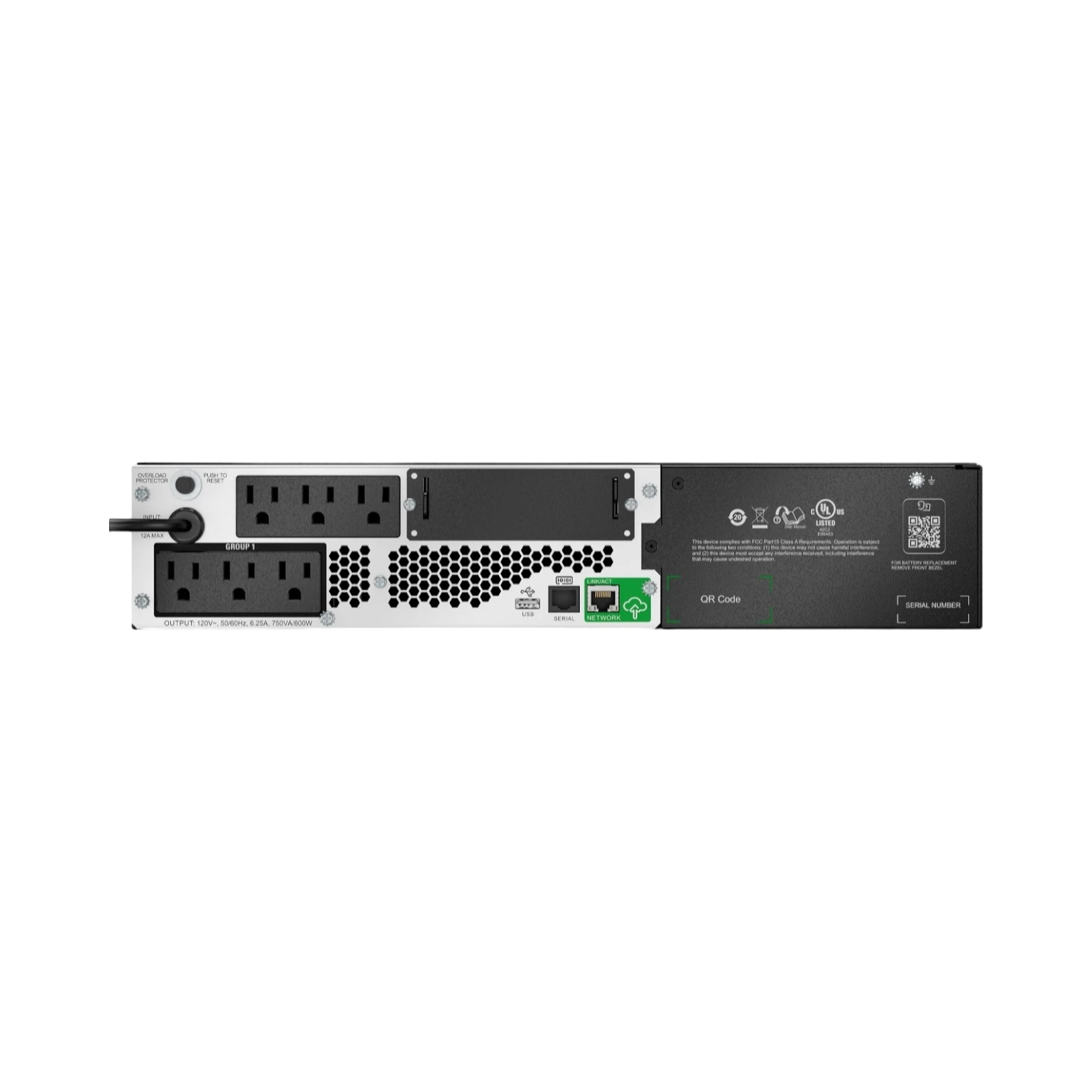 This UPS supports multiple connection options to fit into diverse IT environments. The USB and serial ports allow straightforward communication with monitoring software, while the SmartSlot interface provides expandability for additional management cards or accessories. These features make it easy to integrate the UPS into existing network infrastructures and monitor power status remotely.