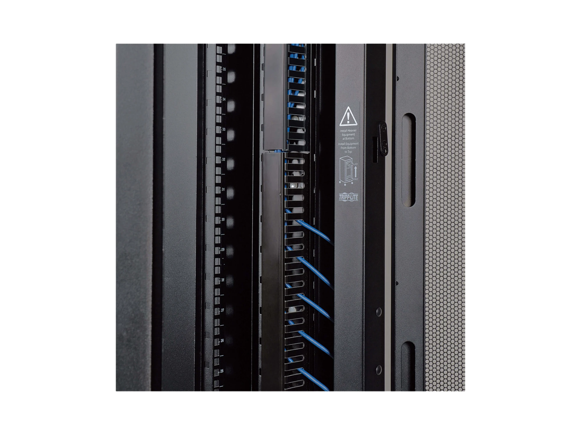 The Tripp Lite SR42UBDP48 is a 42U server rack designed to house high-density IT equipment that requires extra depth, with a spacious 48-inch (1219 mm) depth to accommodate larger or deeper rack-mounted devices. Constructed from durable powder-coated steel, it supports a stationary load of up to 3000 lbs and a rolling load of 2250 lbs, making it suitable for demanding data center and network closet environments. This rack comes fully assembled with lockable doors and side panels, providing both security and ease of use for professional setups.