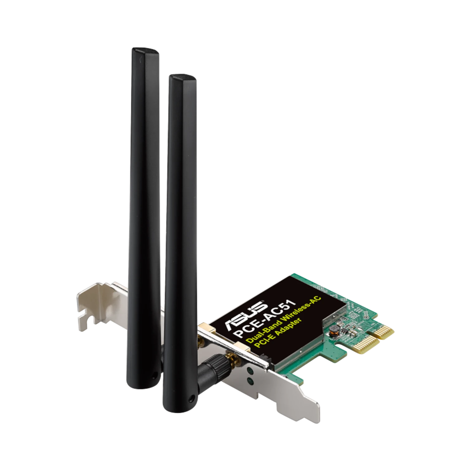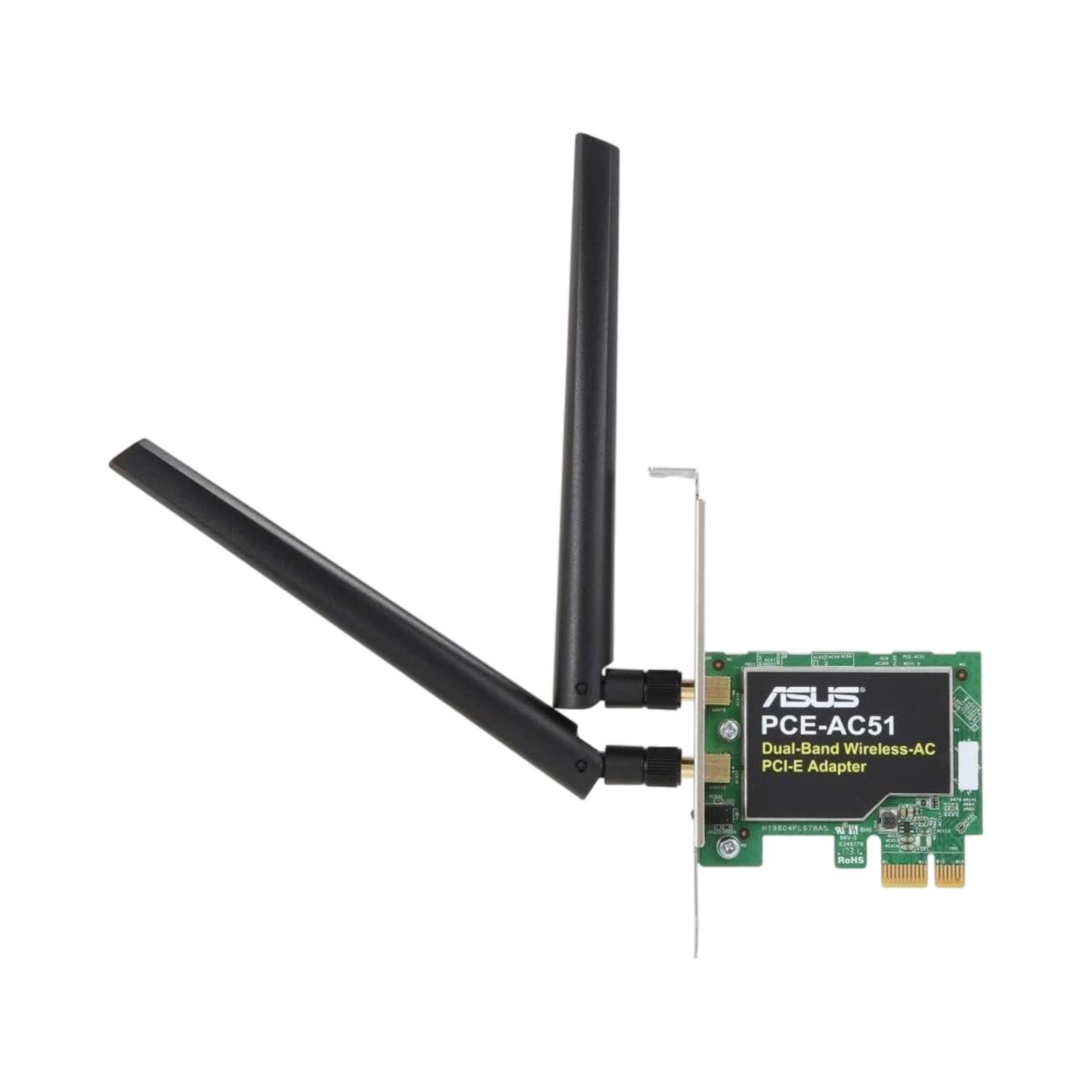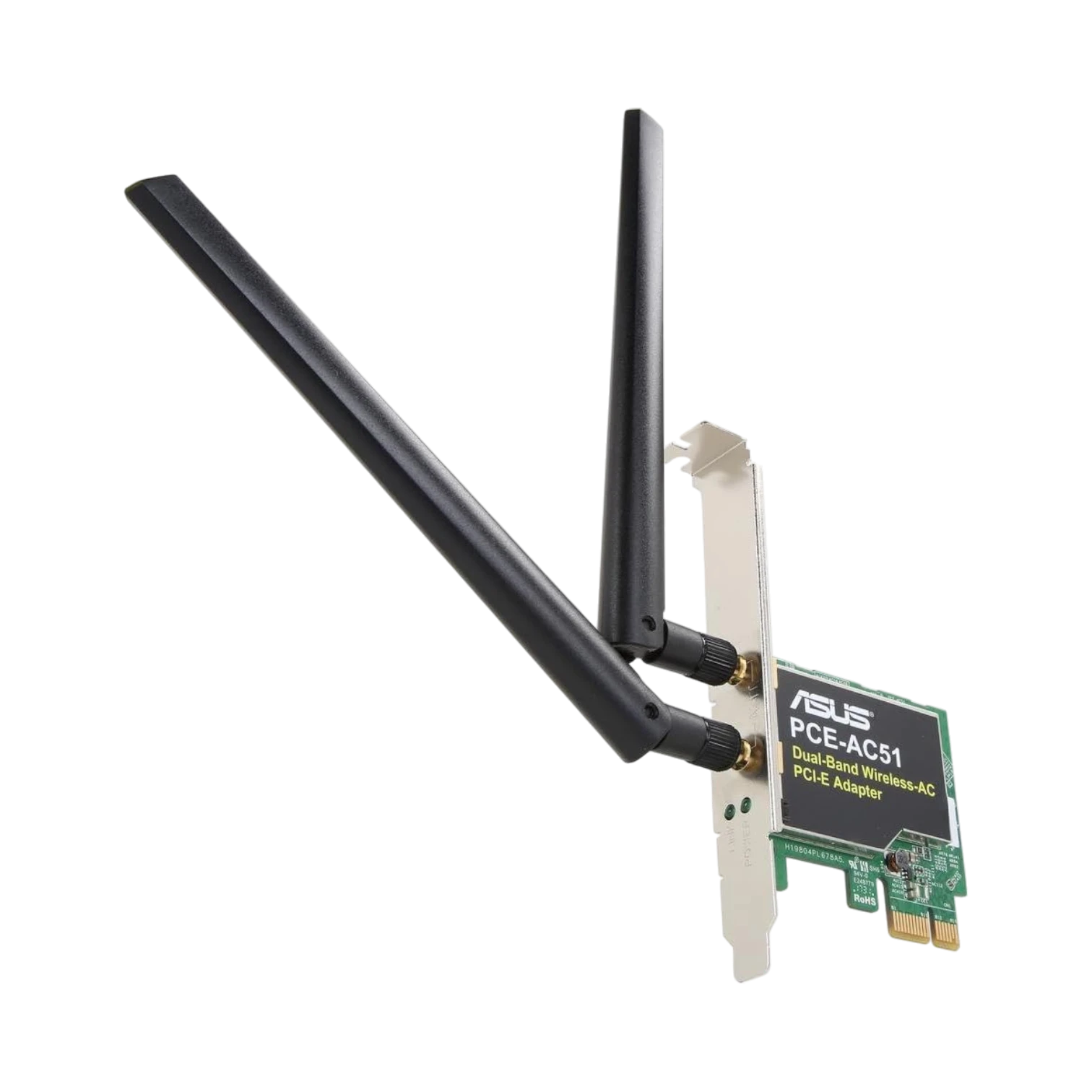 The ASUS PCE-AC51 is a wireless AC750 PCIe Wi-Fi card designed to enhance your desktop computer's internet connectivity by providing fast and stable wireless access. It supports dual-band operation on both 2.4 GHz and 5 GHz frequencies, delivering speeds up to 750 Mbps with the 802.11ac Wi-Fi standard. This card fits into PCIe x1 or x16 slots, making it a convenient upgrade for desktops that need reliable wireless networking for streaming, gaming, or video calls.
