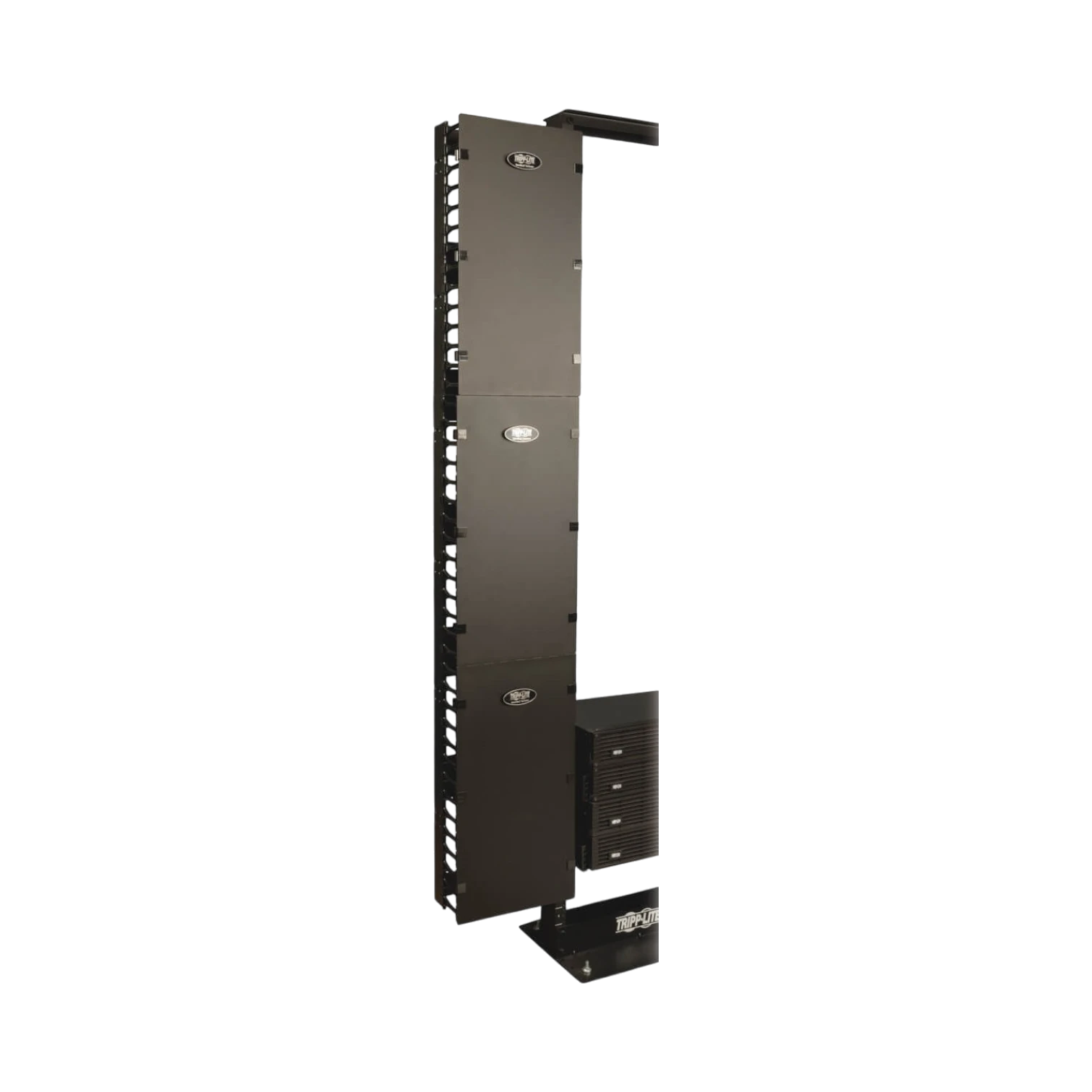 The Tripp Lite SRCABLEVRT12 is a vertical cable manager designed to organize and protect large bundles of cables within open rack cabinets. Standing 6 feet tall and 12 inches wide, it provides ample space to manage cables efficiently, reducing stress and tangling. Its three separate 2-foot sections offer flexible installation options to fit various setups and space constraints. The finger duct design with a cover keeps cables neatly arranged while allowing easy access for adding or removing connections. Built from durable cold-rolled steel with a black finish, this cable manager is well suited for demanding IT environments and data centers.