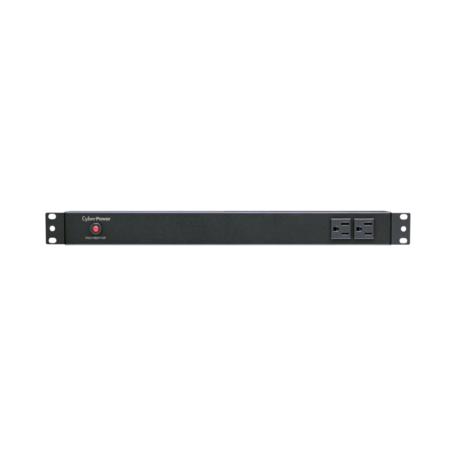 The CyberPower PDU15B2F12R is a power distribution unit designed to efficiently supply unfiltered power to multiple devices in datacenters, industrial environments, and professional IT setups. It features 14 NEMA 5-15R outlets, with 12 positioned at the rear and 2 at the front, operating within a 100 to 125-volt range and supporting up to 15 amps. Its robust metal housing and 15-foot power cord provide durability and flexible placement, making it a practical choice for managing power distribution in demanding spaces.