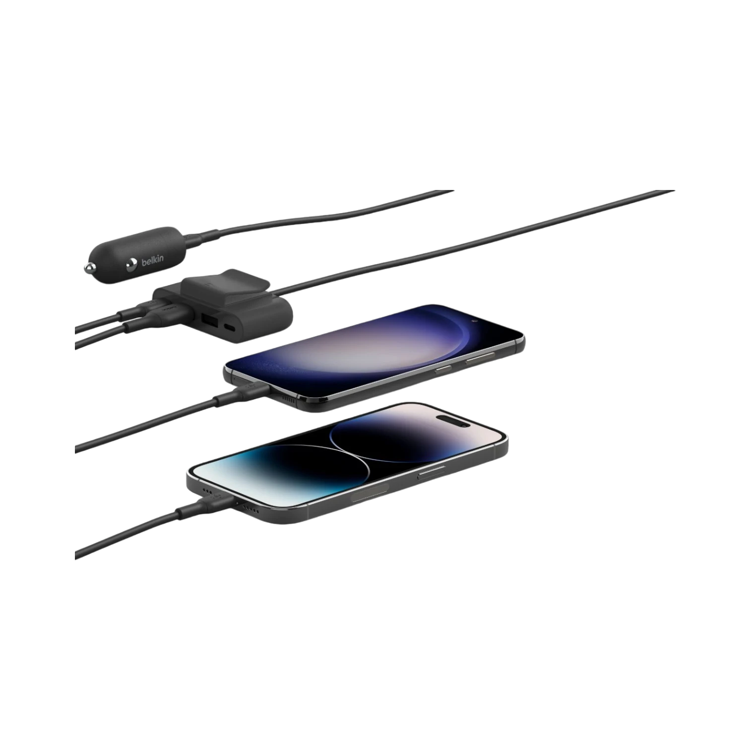 The Belkin CCA004TT2MBK-B7 is a 30W USB-C car charger with a 4-port USB power extender designed to keep multiple devices charged while on the road. It connects to your car’s power outlet and includes a 6.6-foot cable that extends charging access to passengers in both front and back seats. With two USB-C ports and two USB-A ports, it supports simultaneous charging of smartphones, tablets, and other USB-powered devices, delivering a combined 30 watts of power with PPS technology for efficient and safe charging.