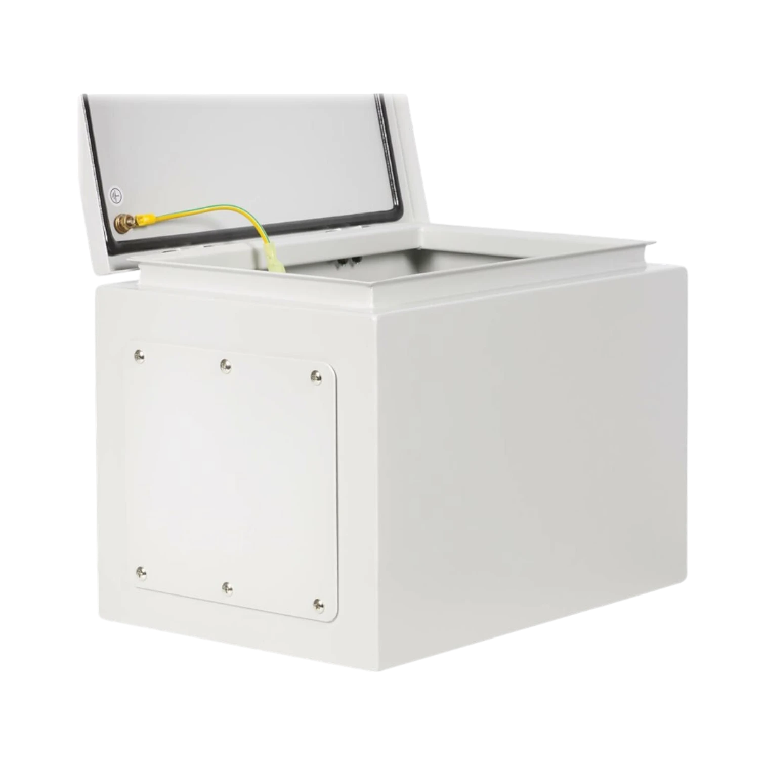 The enclosure comes fully assembled with pre-installed rear panels, which streamlines the setup process and reduces installation time. Its compact size fits well in tight spaces, while the bottom conduit cutout facilitates organized cable entry and exit. Whether mounted on a wall or ceiling, the enclosure adapts to various industrial or outdoor environments, making it straightforward to integrate into existing setups.