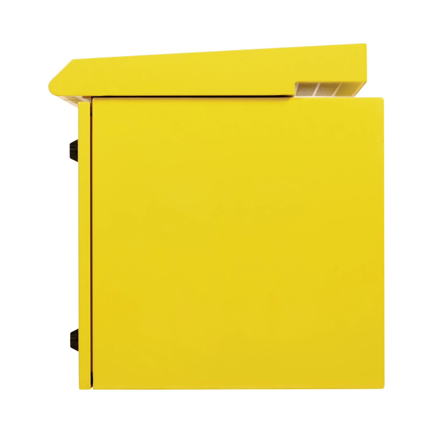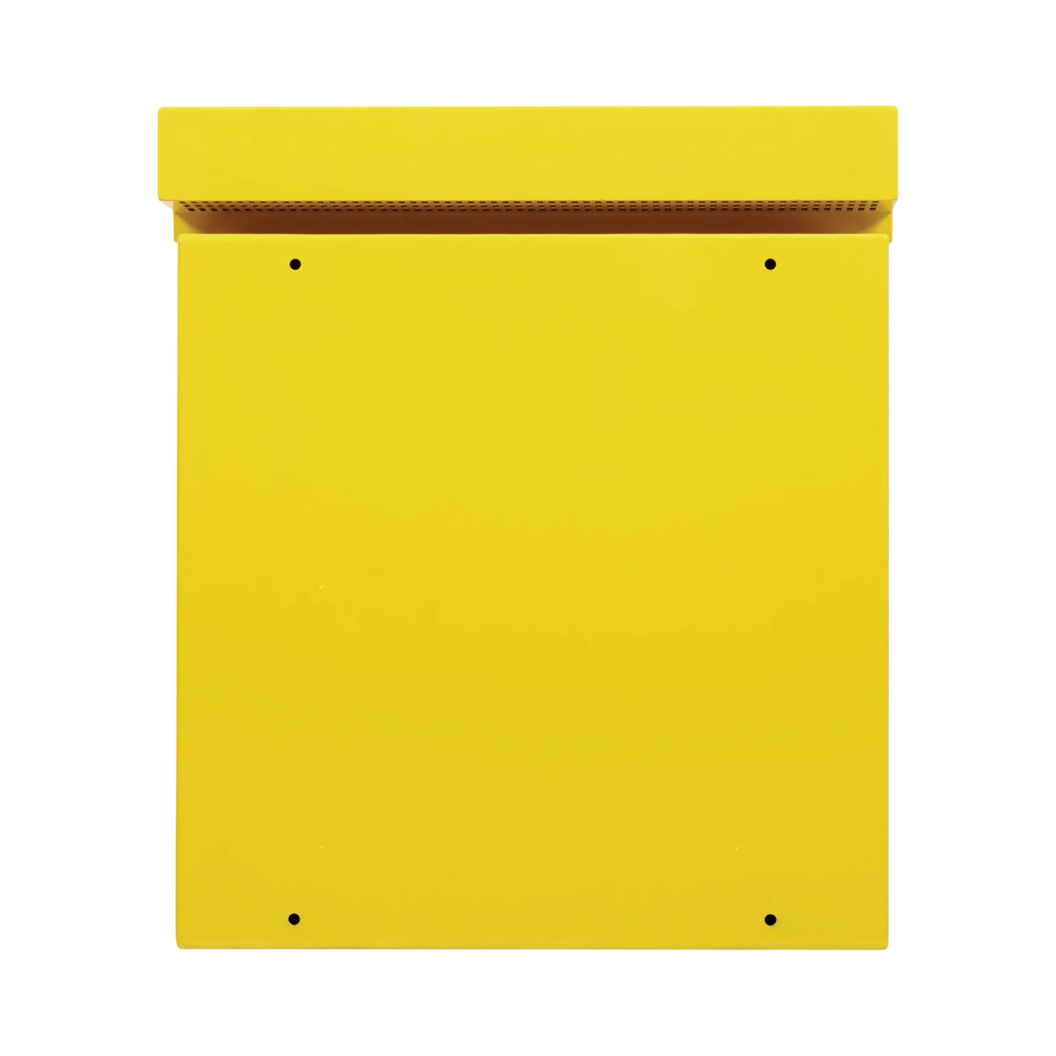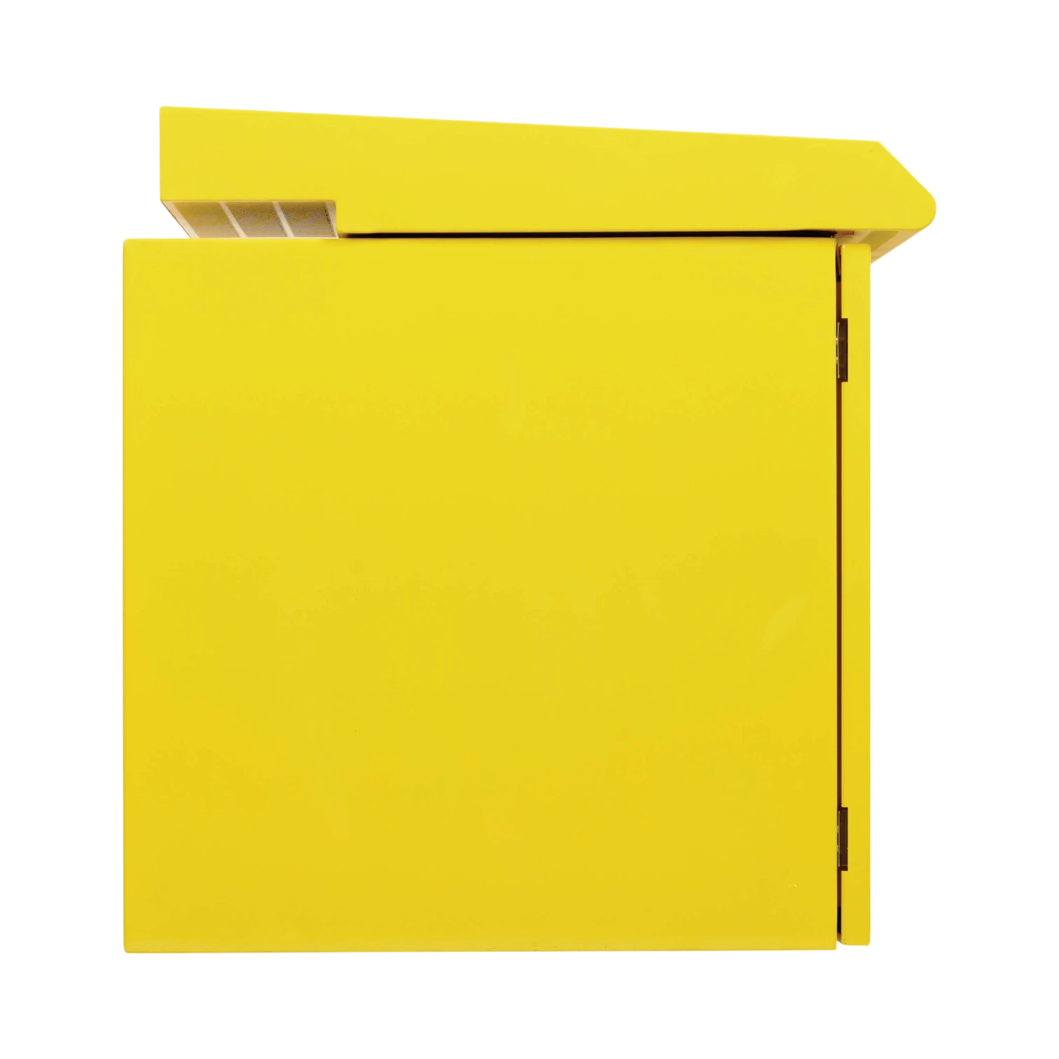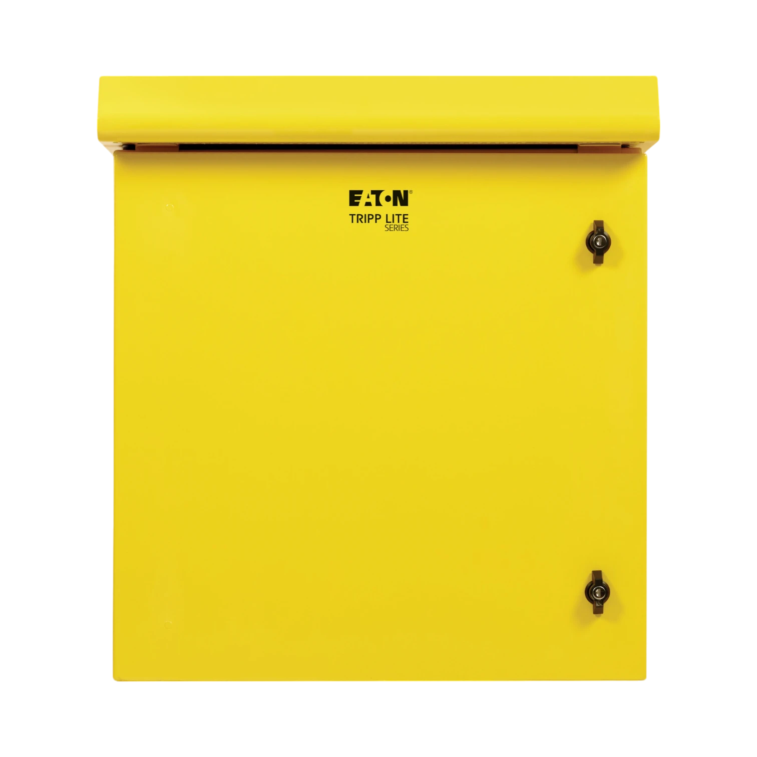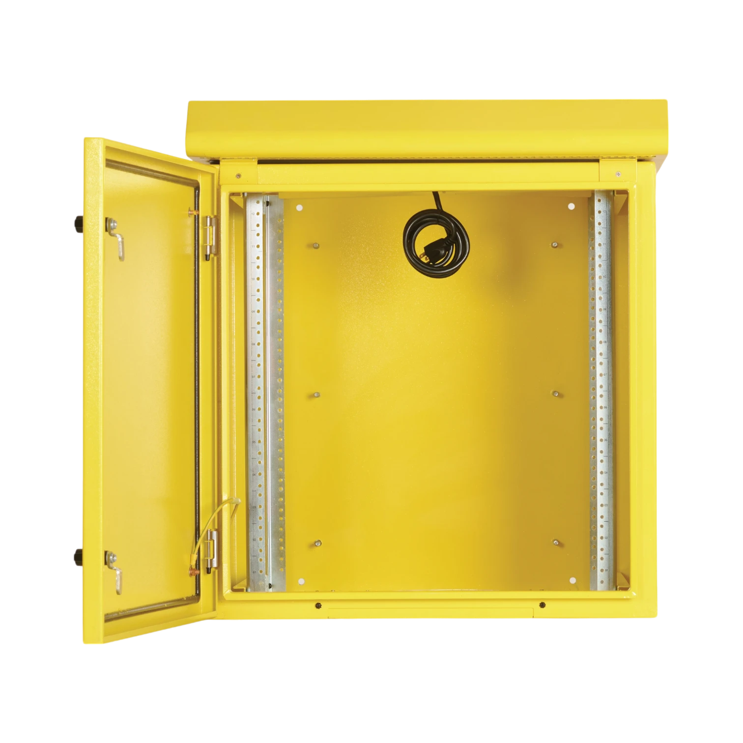 Constructed from sturdy steel with a yellow powder-coated finish, this enclosure includes a secure locking system to prevent unauthorized access. It also features built-in fans that activate automatically at 86°F (30°C) to maintain optimal operating temperatures for your equipment. The unit ships fully assembled and is designed for easy wall mounting, making installation straightforward.