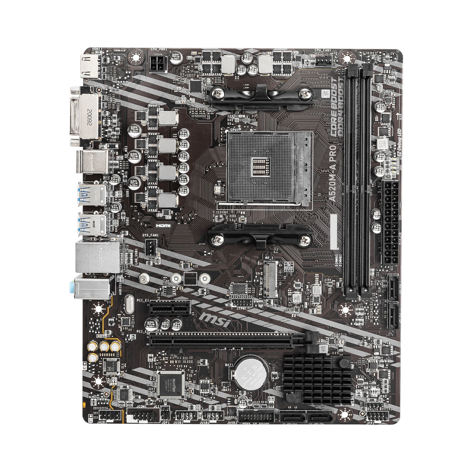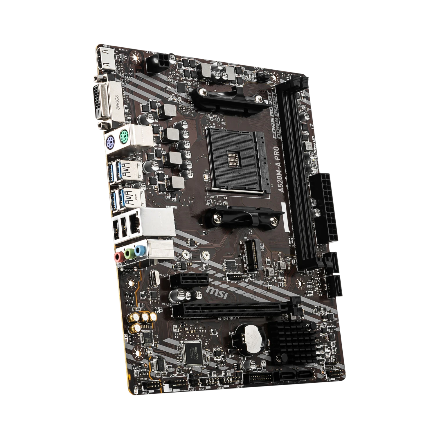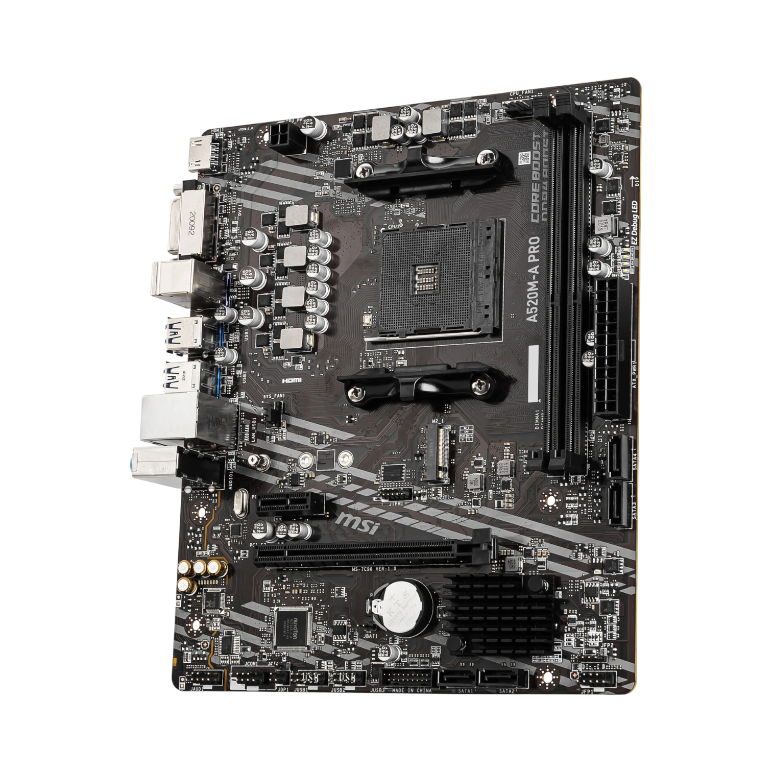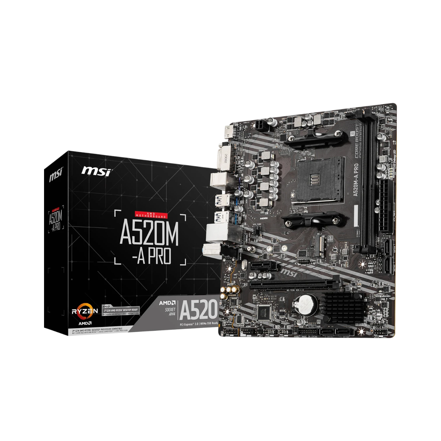 The MSI A520M-A PRO is a Micro-ATX motherboard built around the AMD A520 chipset, designed to support Ryzen 5000, 4000, and 3000 series processors with the AM4 socket. It accommodates up to 64GB of DDR4 memory across two DIMM slots, capable of reaching speeds up to 4600 MHz when overclocked. This motherboard offers a balanced set of features and connectivity options suitable for everyday computing, office tasks, and entry-level productivity setups.