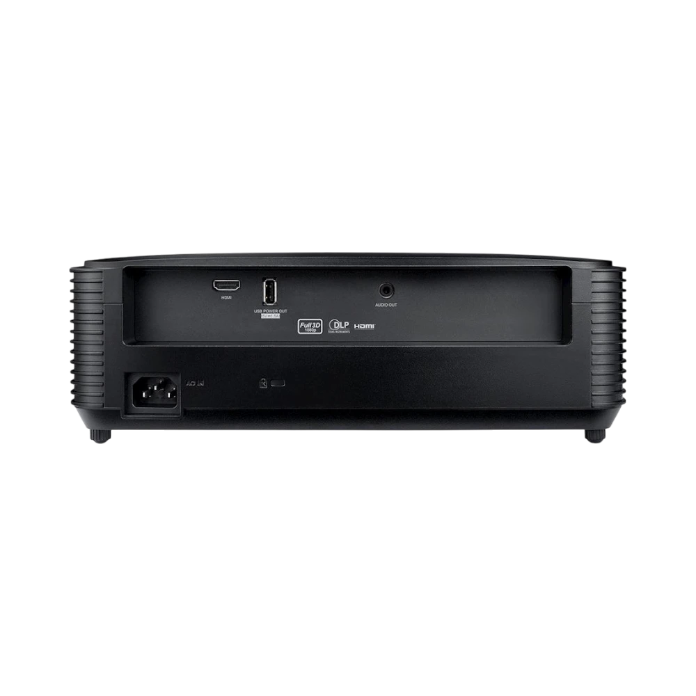 This projector offers HDMI input for connecting high-definition sources such as Blu-ray players, gaming consoles, and streaming devices. The USB power port can supply power to accessories like streaming sticks, while the 3.5 mm audio output allows connection to external speakers or headphones for improved sound quality. Its support for HDMI 1.4a ensures compatibility with full 3D content when paired with appropriate glasses.