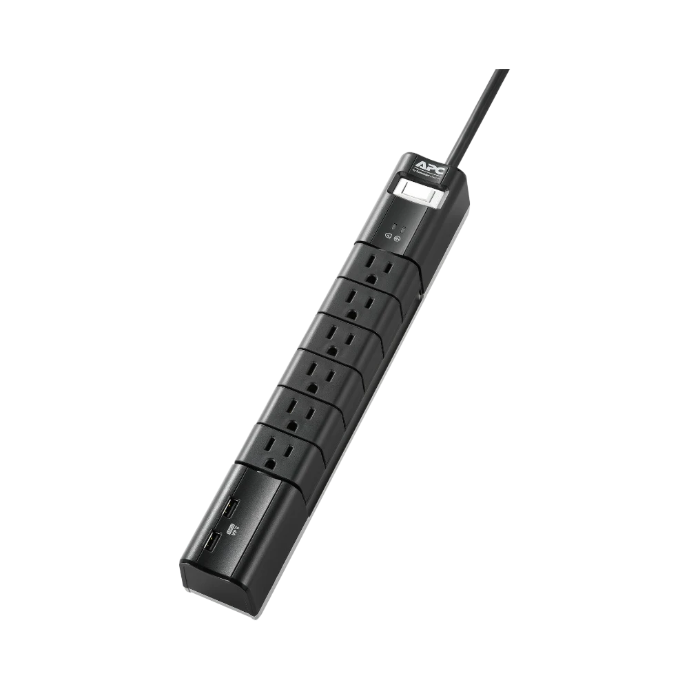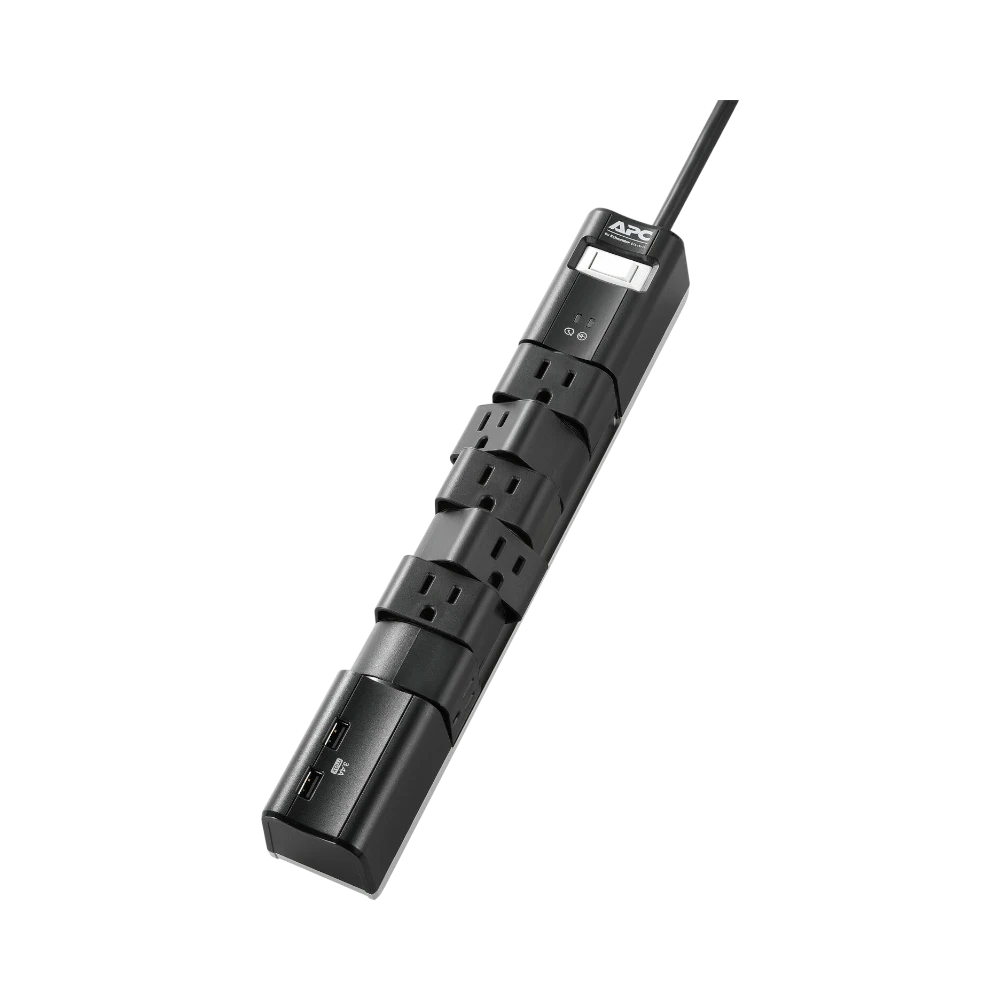 The APC PE6RU3 is a surge protector designed to safeguard your electronic devices while providing versatile power access. It features six rotating outlets that accommodate plugs of various sizes without blocking adjacent sockets, along with two USB ports delivering a combined 3.4 amps for charging smartphones, tablets, and other USB-powered devices. With 1080 joules of surge protection, this unit helps shield your equipment from sudden power spikes and lightning strikes, making it a reliable choice for home offices, entertainment setups, and other environments where clean and safe power is essential.
