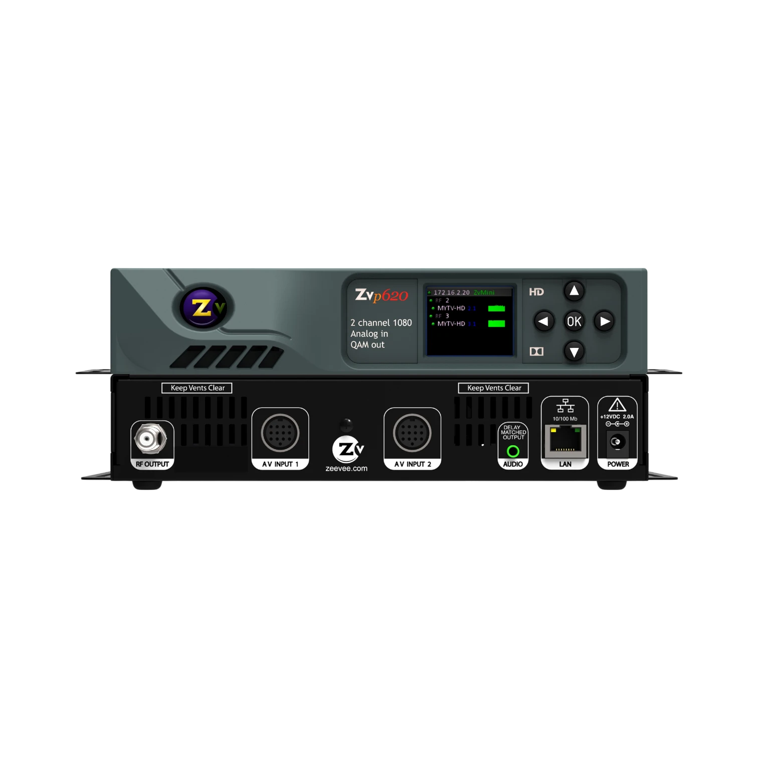 The ZeeVee ZVPRO620-NA is a dual channel encoder and QAM modulator designed to convert component or VGA video signals into digital television channels. It supports high definition resolutions including 1080p, 720p, and 480p, enabling you to broadcast HD content over existing coaxial cable infrastructure. This makes it an efficient solution for venues like sports bars, schools, offices, and hospitality environments that want to distribute video without rewiring.