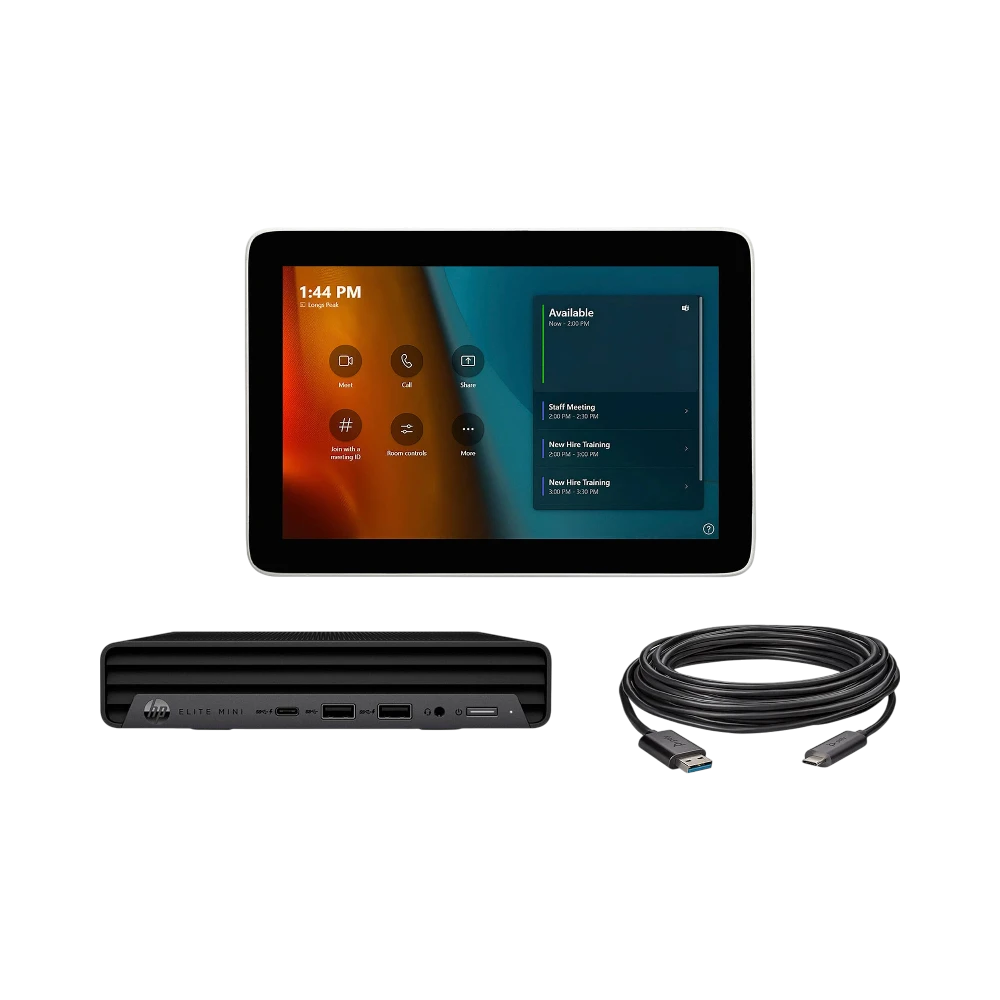 The included Poly GC8 touch controller features an 8-inch WXGA IPS display, offering an intuitive interface to start, control, and end meetings effortlessly. A 10-meter optical USB cable helps maintain a clean workspace by reducing cable clutter while ensuring a stable connection between the Mini PC and the touch controller. Durability and security are prioritized with rigorous testing and advanced BIOS protection, making this kit a dependable choice for busy conference rooms.