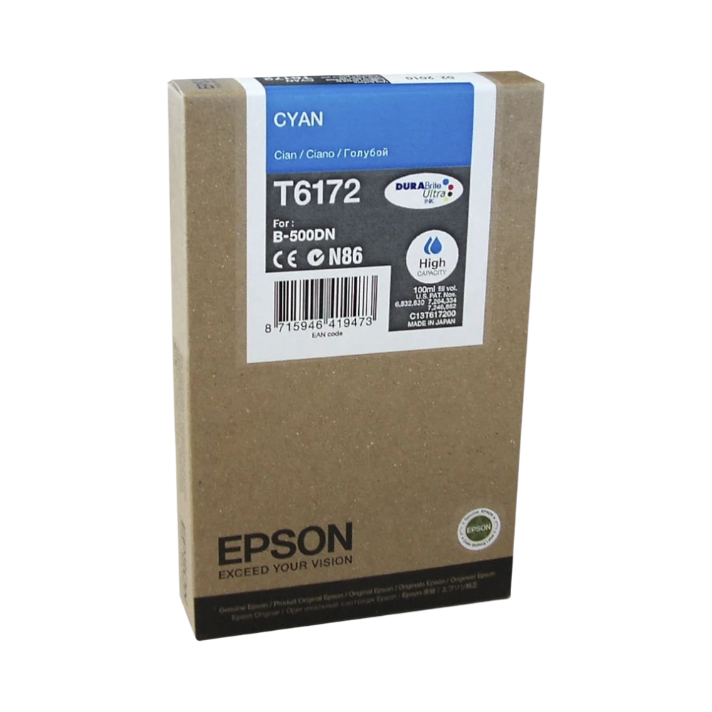The Epson T617200 is a high-yield cyan ink cartridge designed for Epson B-500DN and B-510DN printers. It supports large volume printing by delivering up to 7,000 pages, making it a practical choice for offices and businesses that require reliable and consistent color output. The cartridge uses DURABrite Ultra ink, which produces vibrant cyan tones with sharp detail and offers strong resistance to smudging, water, and fading, ensuring documents and graphics maintain their quality over time.