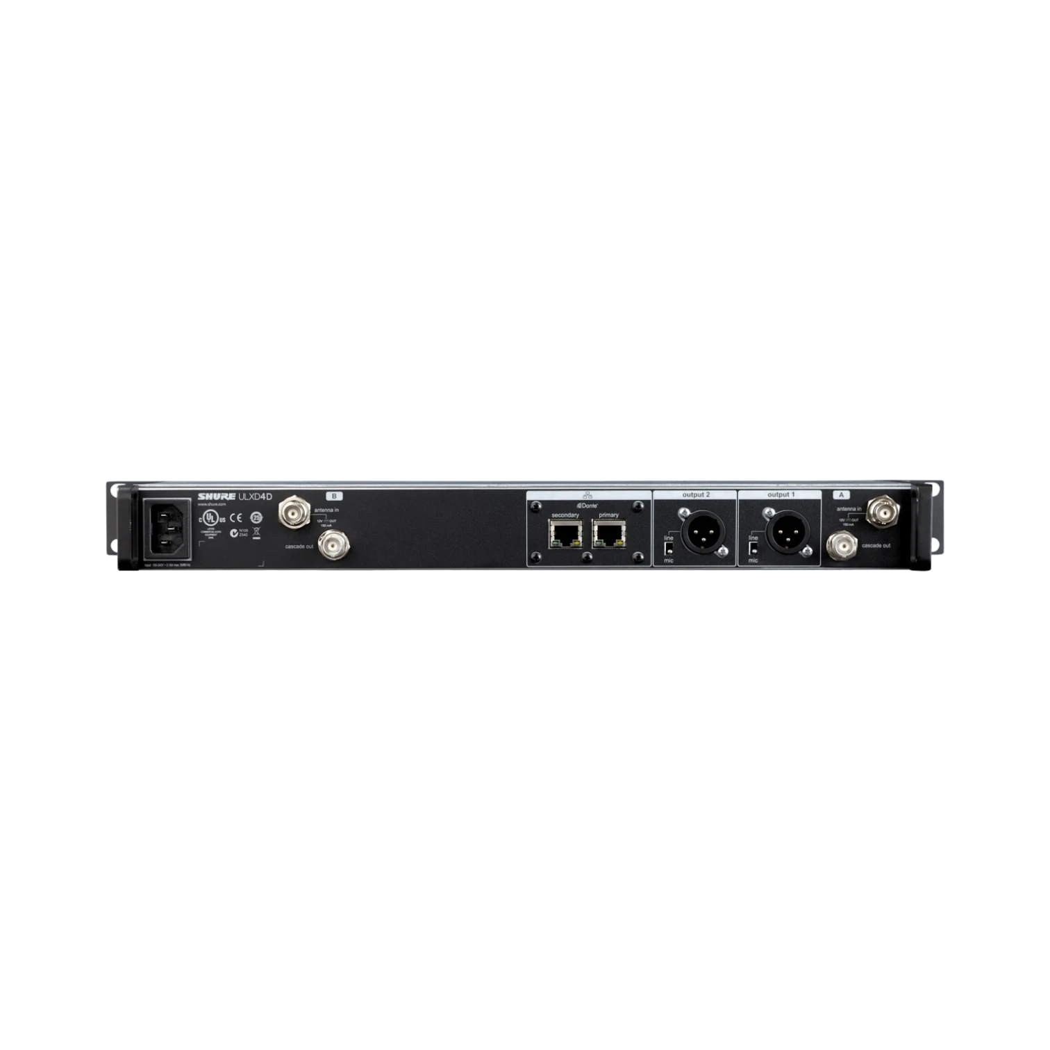 The ULXD4D=-J50A offers versatile connectivity options to fit into professional audio environments. Dual Ethernet ports support Dante networking, allowing digital audio to be routed efficiently across compatible systems. RF cascade ports enable antenna sharing between multiple receivers, which simplifies antenna management in large setups. This receiver works seamlessly with a wide range of Shure transmitters, making it adaptable to various wireless microphone configurations.