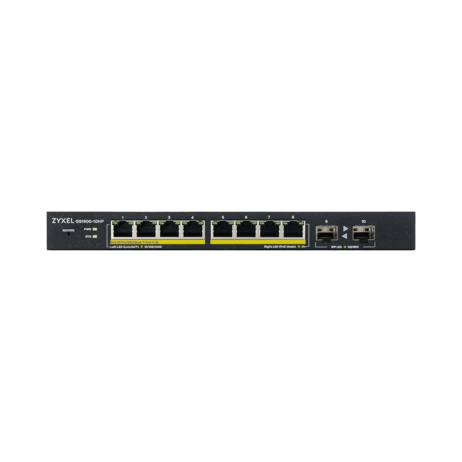 The Zyxel GS1900-10HP is a smart managed switch designed to deliver reliable and efficient network performance for small businesses. It offers 10 Gigabit Ethernet ports, including 8 PoE+ ports that provide a total power budget of 77 watts, allowing you to power devices like Wi-Fi access points, IP cameras, and VoIP phones without needing separate power adapters. Its fanless design ensures quiet operation, making it well suited for office environments where noise reduction is important.